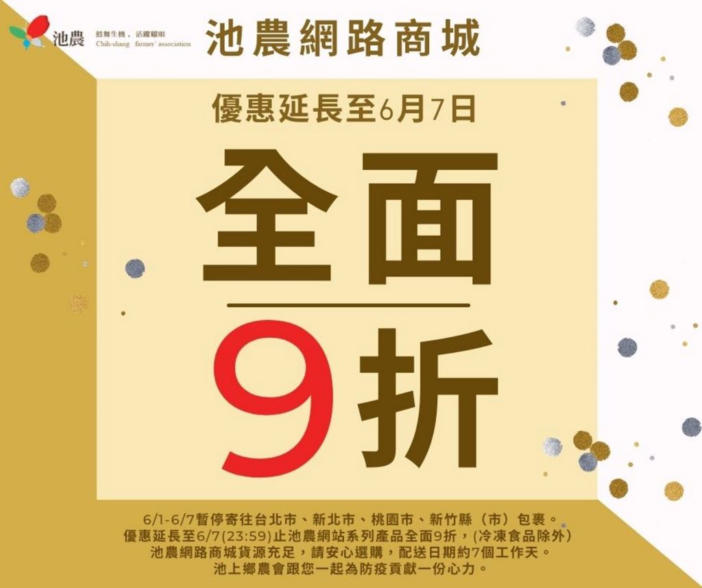 【池上網路商城優惠活動延長至6/7】 📌疫情期間為配合物流服務時間 📌6/1-6/7暫停寄往台北市、新北市、桃園市、新竹縣(市)包裹。 📌優惠活動延長至6/7(23:59)止,臺灣本島地區購買池農網站系列產品ㄧ律打9折,(冷凍食品除外) 📌商城貨源充足,請安心選購,配送日期約7個工作天, 📌池上鄉農會跟您一起為防疫貢獻一份心力。 www.csfa.com.tw