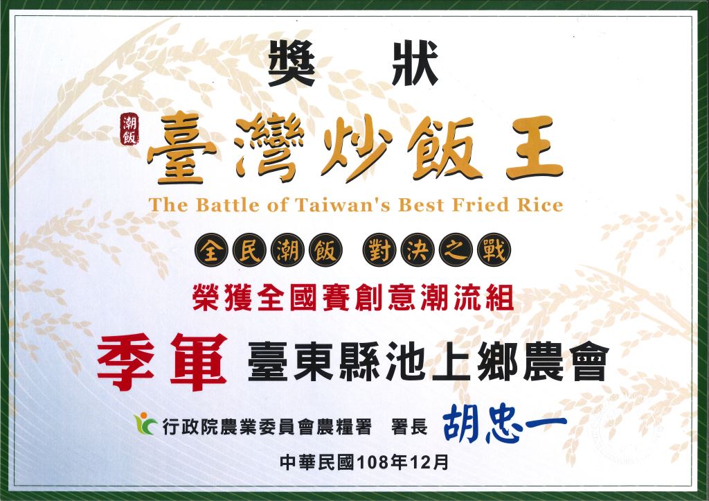 配合在地四季產物,池上鄉農會田媽媽餐廳將各種在地蔬菜、水果融入料理當中,搭配具產銷履歷驗證的池上優質好米為主要原料參加108年農糧署舉辦「臺灣炒飯王-全民潮飯對決之戰」,以「剝皮辣椒老菜圃雞肉炒飯」一舉獲得全國賽創意潮流組季軍炒飯。