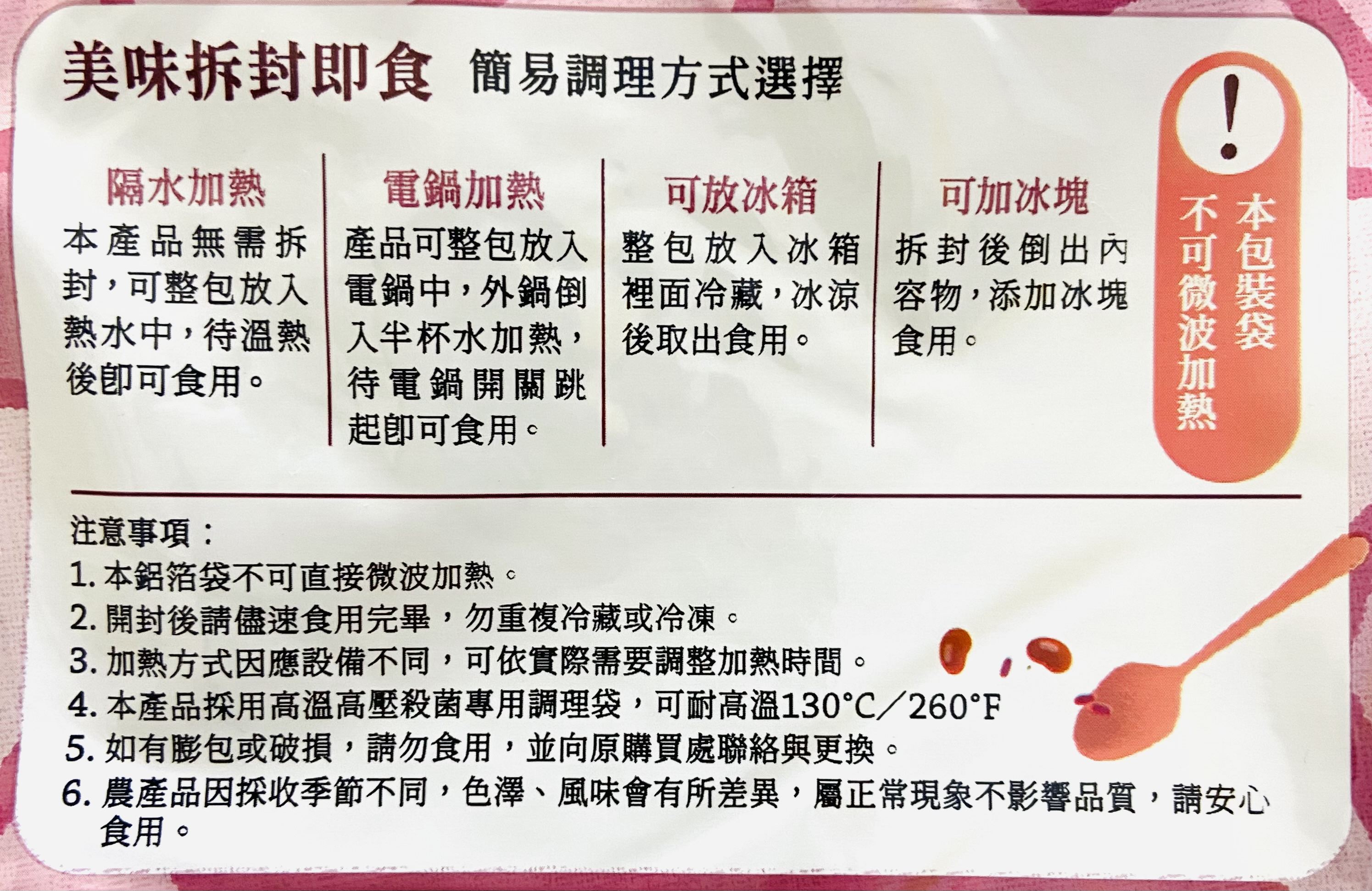 ‧本產品採用高溫高壓殺菌專用調理袋,可耐高溫130度C/260度F
